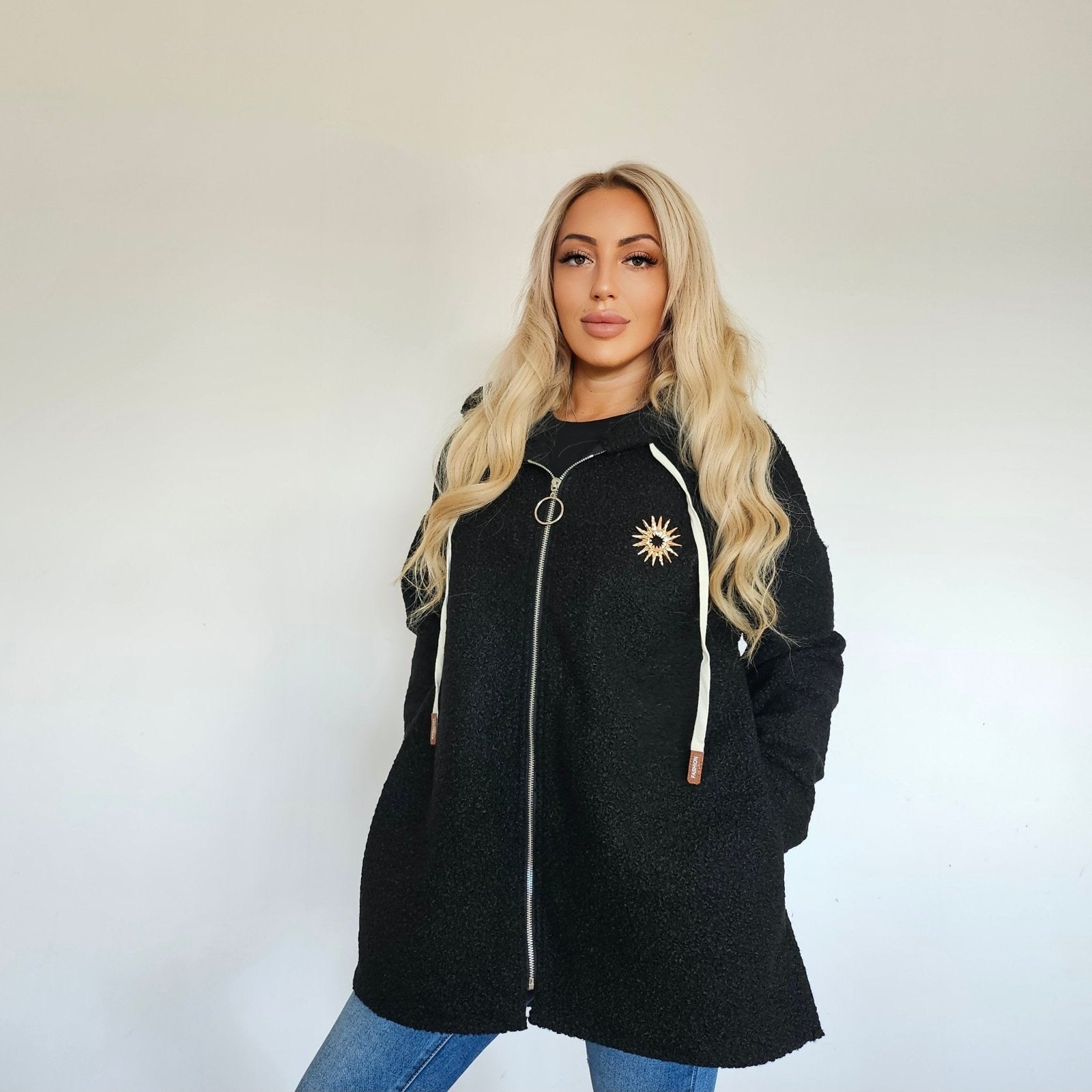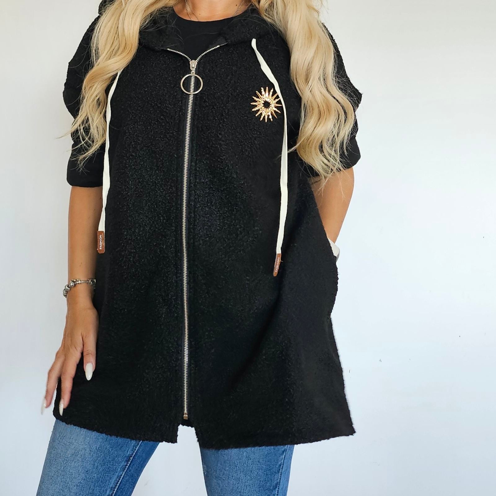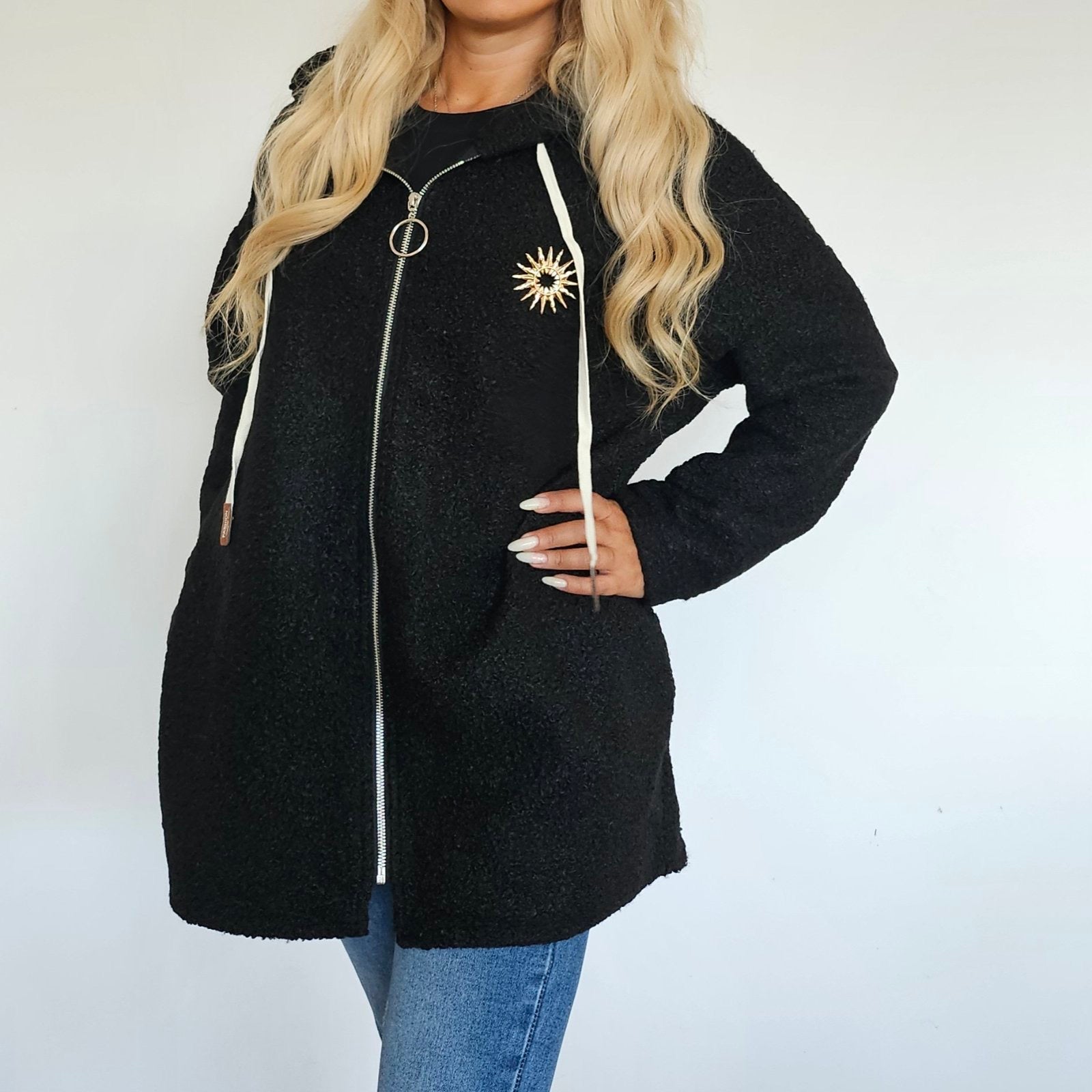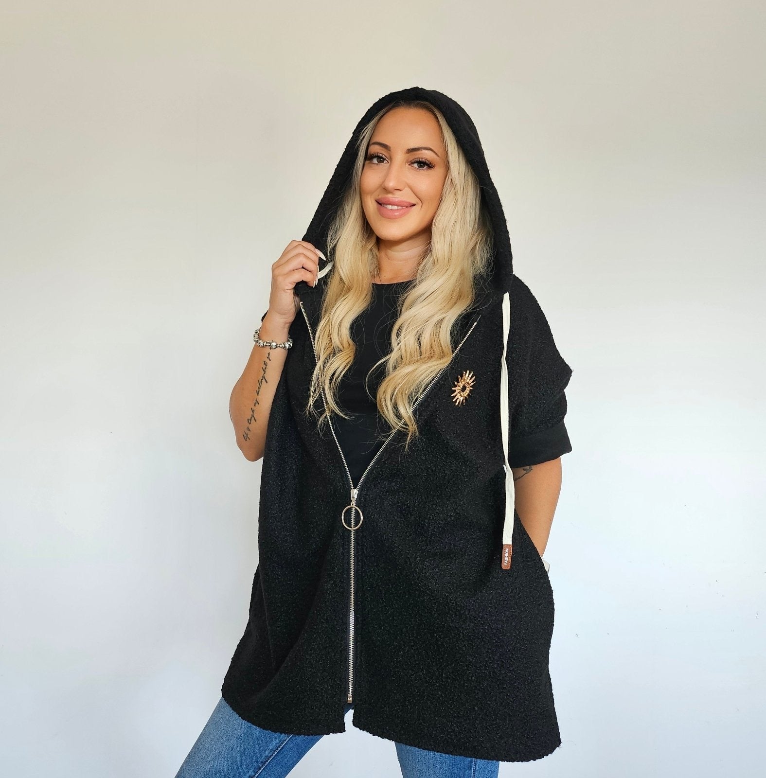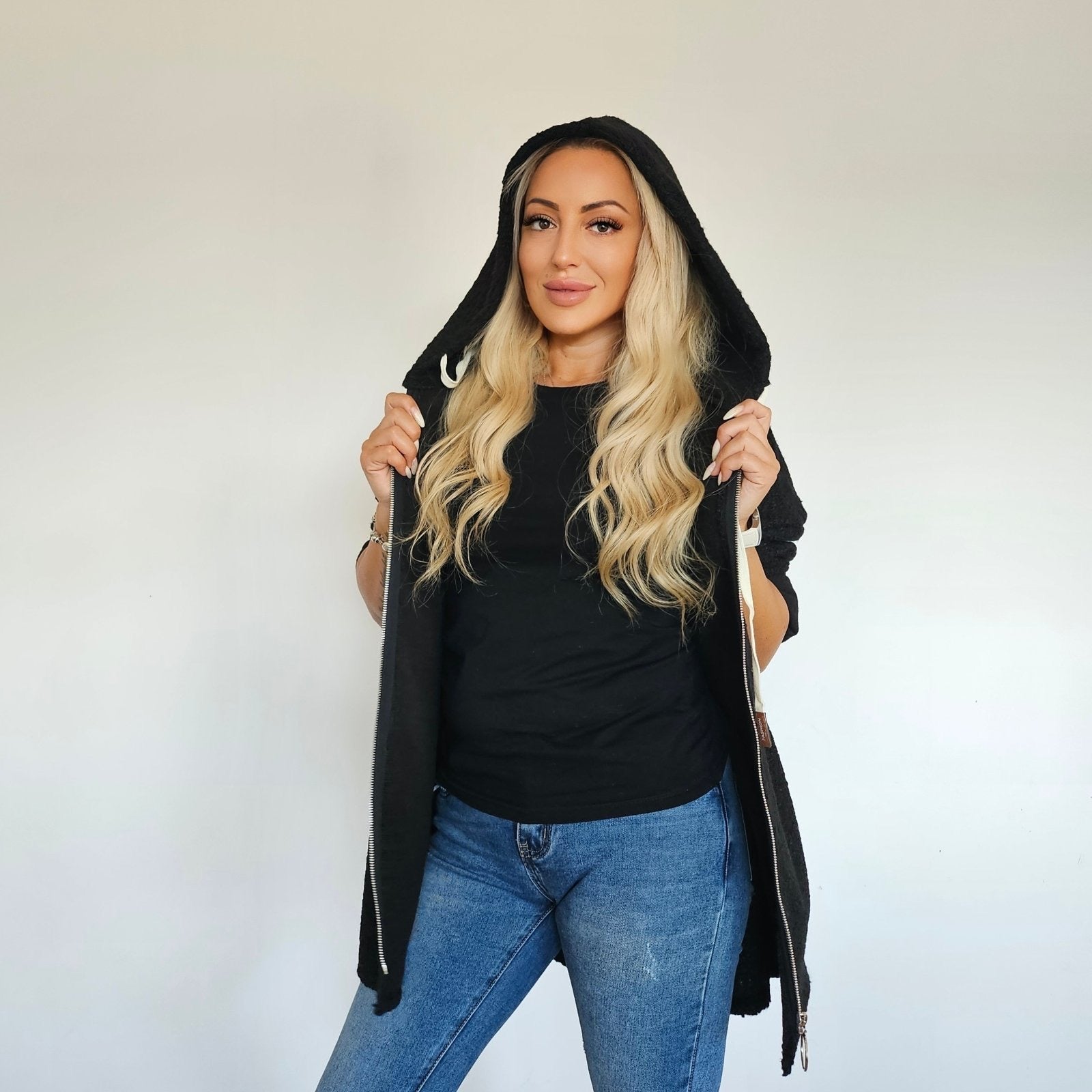 Стилна и практична връхна дреха в черно, съчетаваща удобство и модерна визия. Изработена от мека и топла материя, тя е идеалният избор за прохладните дни. Закопчава се с цип и има удобна качулка с връзки.