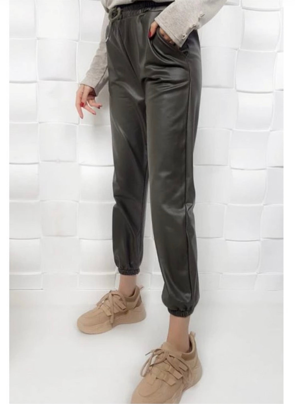 Стилен кожен панталон в черен цвят, съчетаващ модерна визия и удобство. Изработен е от висококачествена еко кожа, която придава луксозен вид и е подходяща за ежедневието и специални поводи. Моделът е с висока талия, ластичен колан с връзки и практични джобове. Долната част завършва с ластик, което подчертава силуета и придава спортно-елегантен стил. Лесно се комбинира както с ботуши и боти, така и с кецове за по-ежедневна визия.