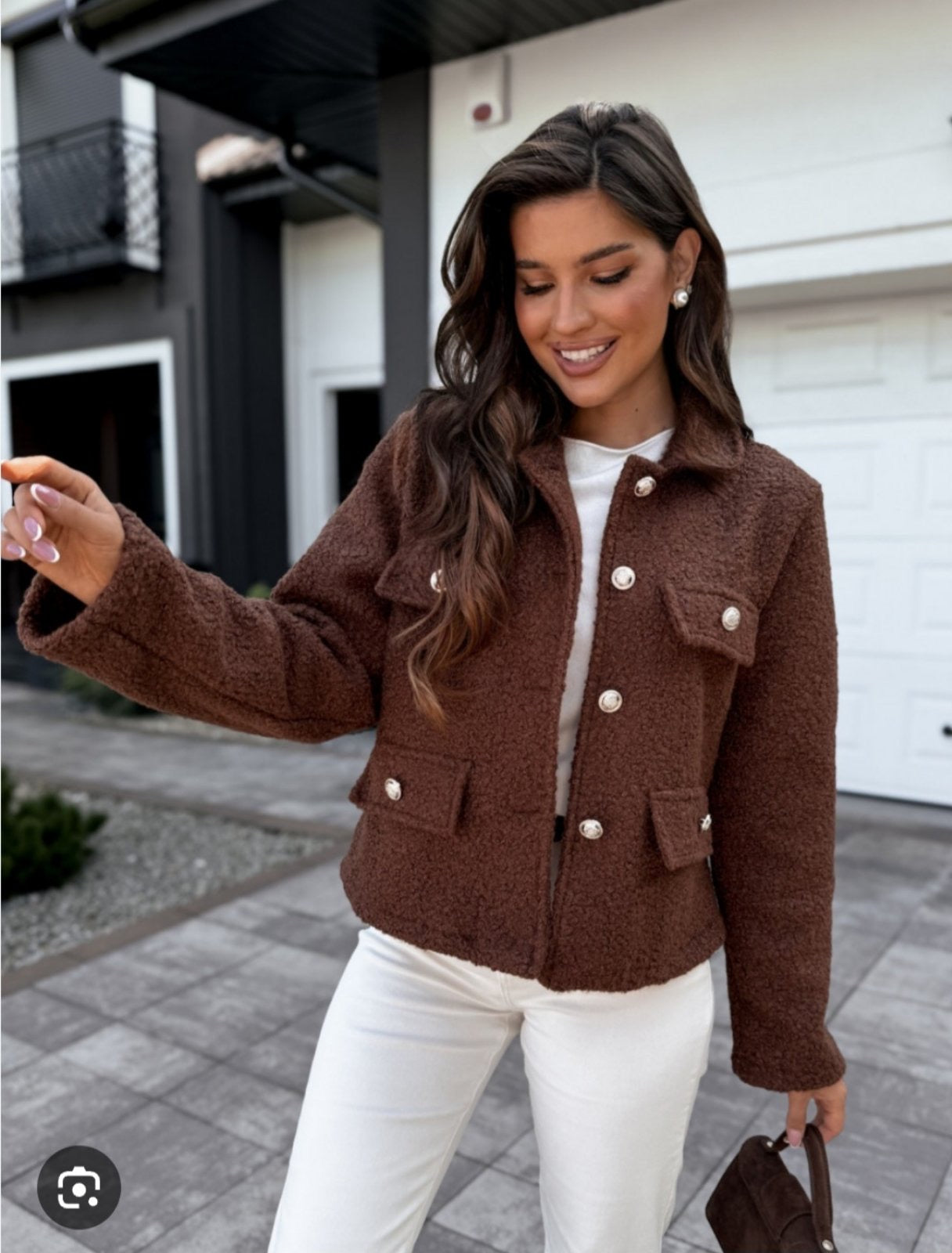 Модерно късо палто в кафяв цвят, съчетаващо стил и удобство. С класическа права кройка и декоративни джобове отпред, то е практично и лесно за комбиниране с всякакви тоалети – от ежедневни до по-елегантни. Големите контрастни копчета придават изискан и елегантен завършек.