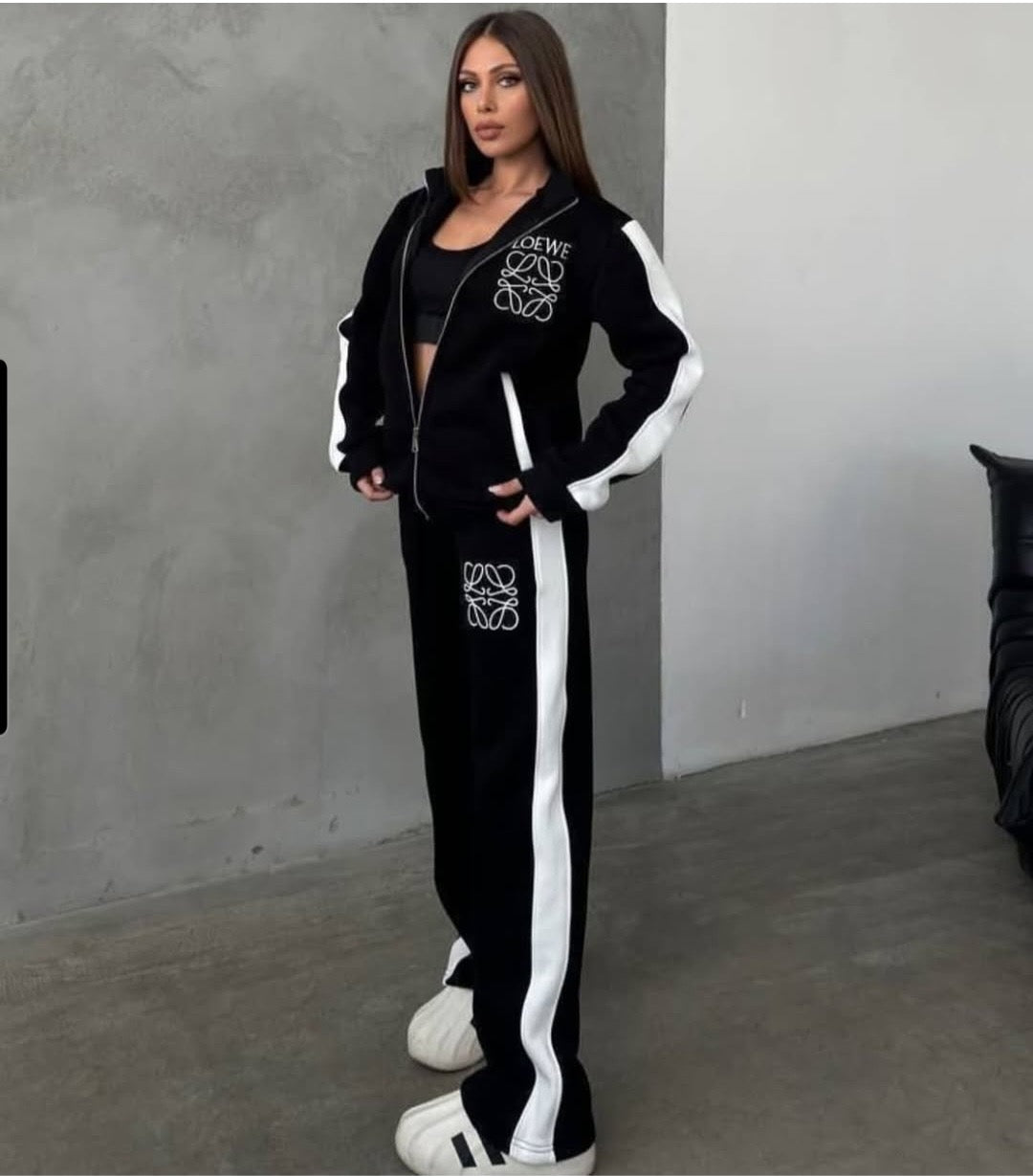 Спортно - елегантен дамски комплект, състоящ се от горнище с цип и дълъг ръкав и панталон с права кройка. Комплектът е в черен цвят с бели кантове отстрани, което визуално издължава силуета. На горнището и панталона има декоративен надпис и лого, които добавят модерен акцент. Подходящ е както за спорт, така и за ежедневно носене.