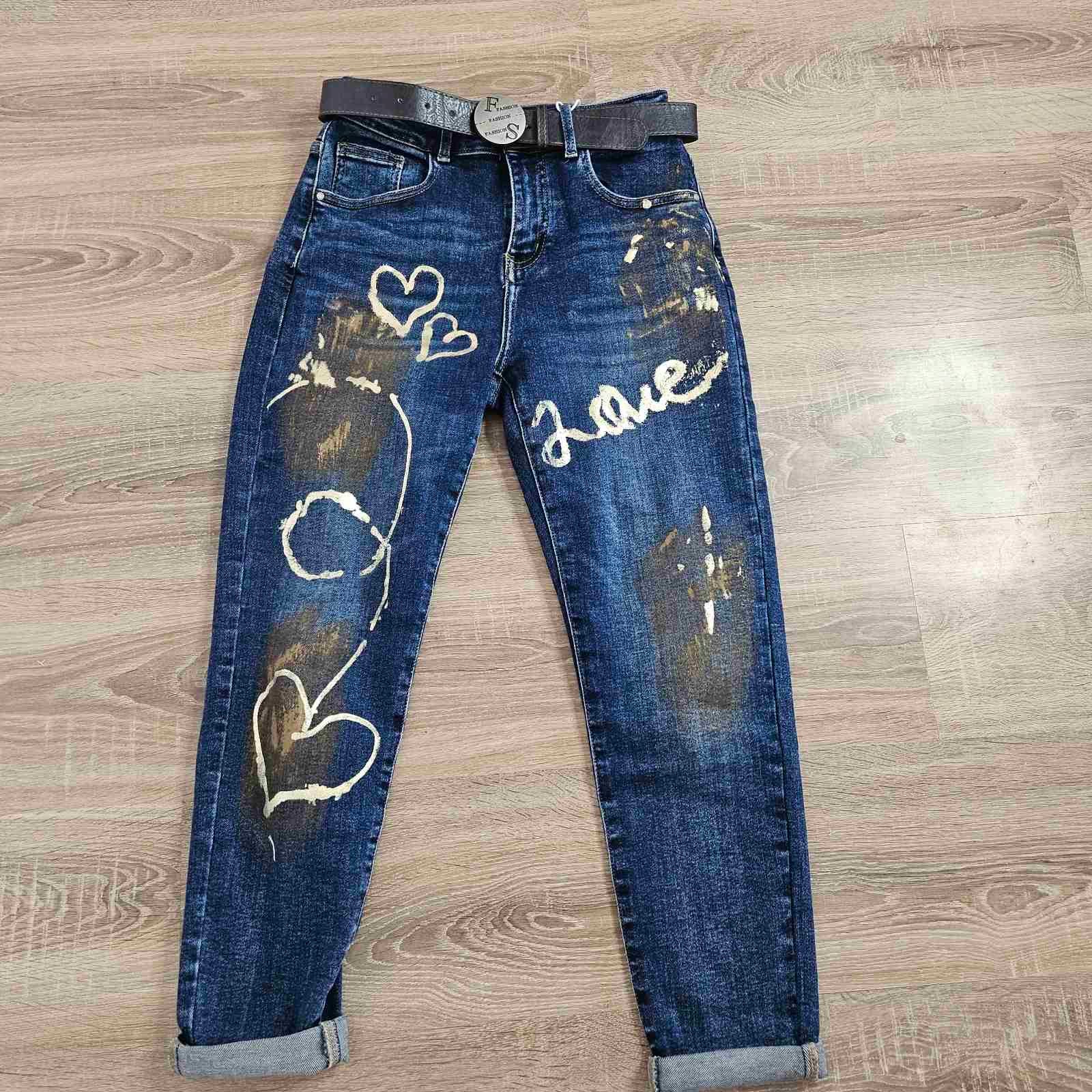 Дънки Love – стилна комбинация от удобство и индивидуалност. Изработени от висококачествен деним, тези дънки се отличават с ръчно нанесени златисти детайли и надписи, които придават уникален и артистичен вид. Моделът е с класическа кройка, леко втален силует и дължина до глезена, което позволява лесно съчетаване с кецове, ботуши или елегантни обувки на ток.
