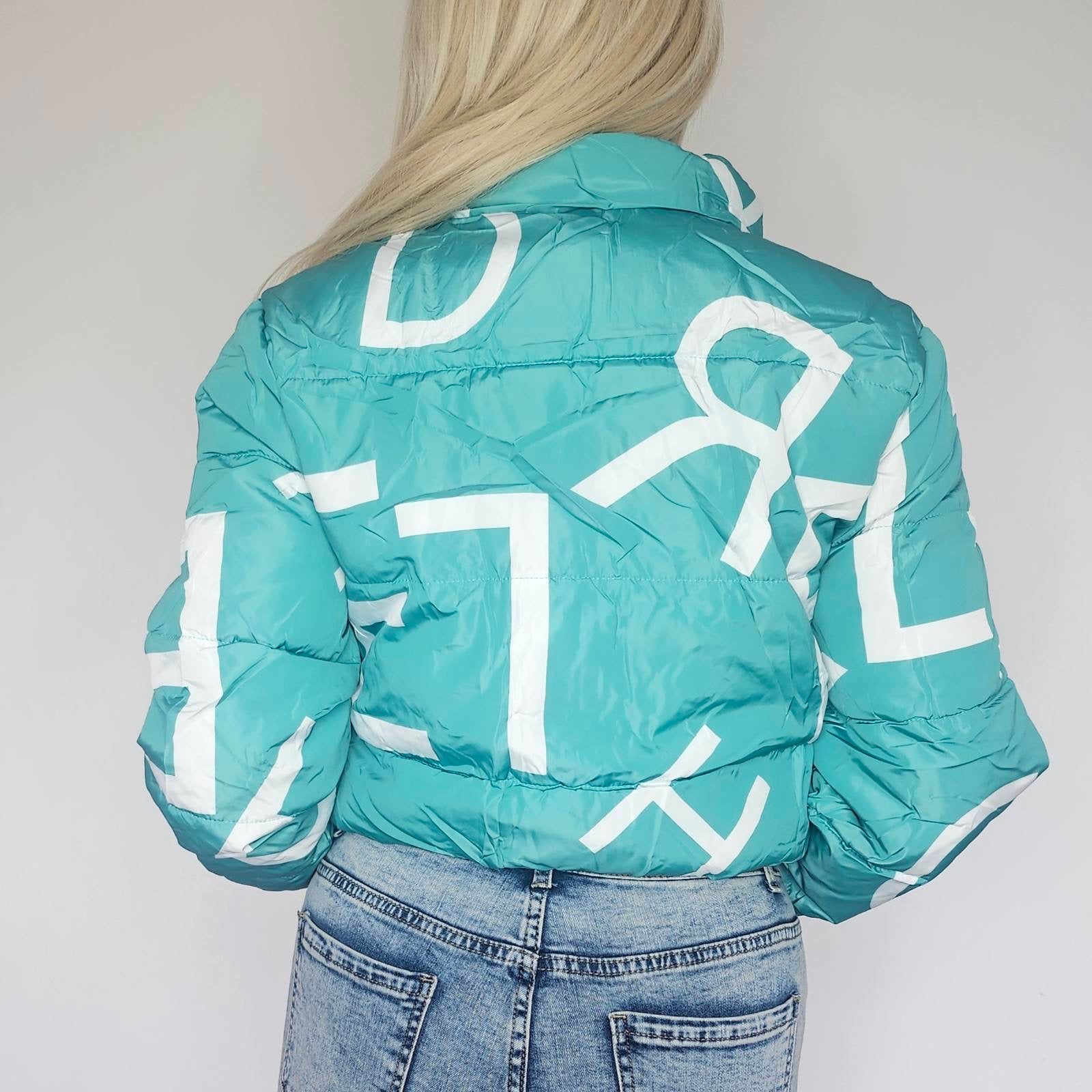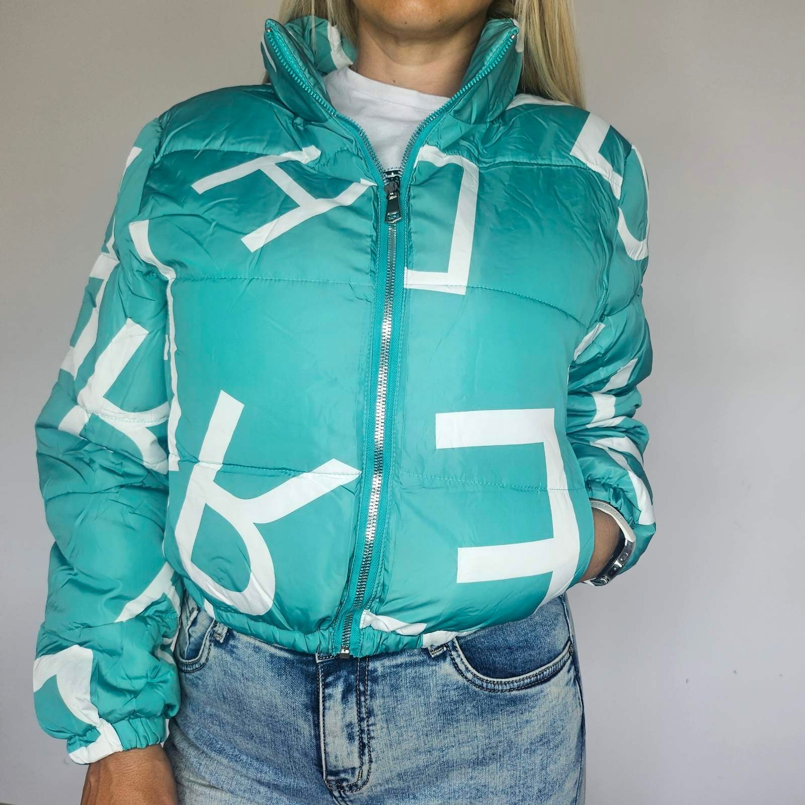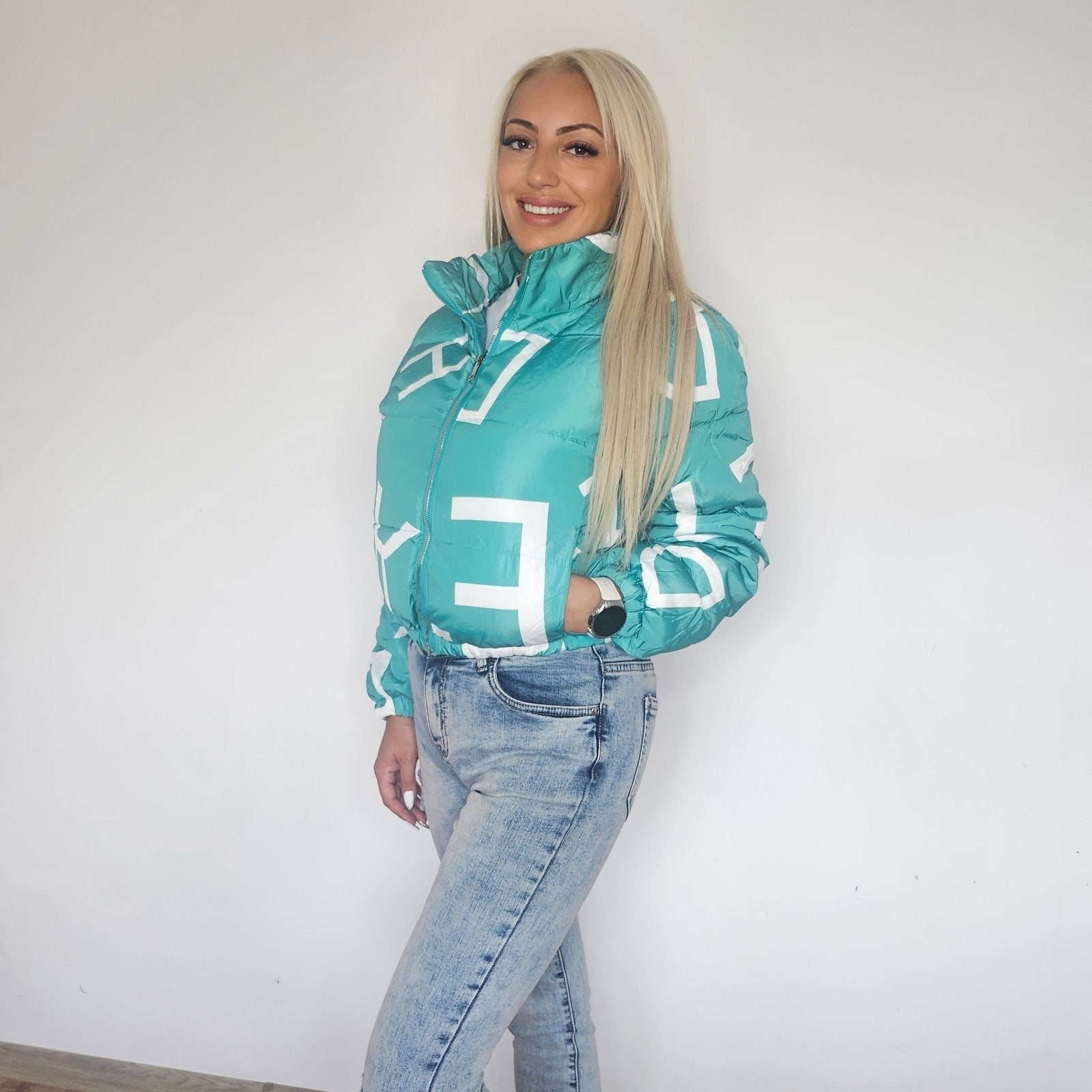 Тренди дамско яке в зелен цвят с модерни бели принтове. Моделът е къс и подчертава талията, като съчетава спортна визия с младежки стил. Якето е с висока яка и цип отпред, осигуряващ удобство и защита в по-хладни дни. Разполага с два странични джоба. Материята е лека, но същевременно топла и комфортна. Идеално е за ежедневието, разходки и спортни комбинации, като внася свеж и забележим акцент във всяка визия.