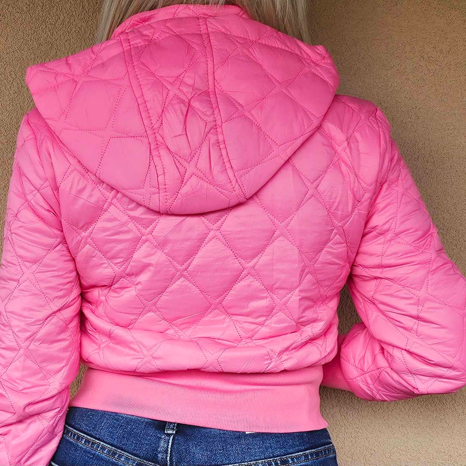 Розово дамско яке с къс спортно-елегантен дизайн. Материята е с капитонирани шевове. Закопчава се с цип отпред, като има и два вертикални джоба с ципове. В талията и ръкавите завършва с широки, еластични, рипсени маншети в черно, които подчертават фигурата и дават комфорт. Якето е със стояща яка и качулка, която се вижда на една от допълнителните снимки.Модерно, удобно и перфектно за сезона.